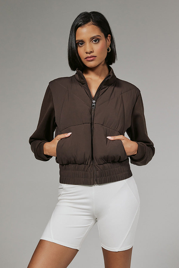 A full-zip mock neck puffer jacket with a wide cinched waistband that creates a flattering look. Offers the perfect amount of warmth for cooler days. WOT-9094