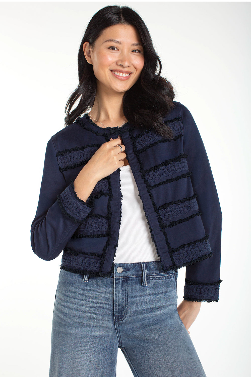 Our collarless jacket with frayed and lace details, is the epitome of chic sophistication. This jacket is designed to be a standout piece in your wardrobe, effortlessly combining classic tailoring with modern details. Whether you're dressing up for a business meeting or adding a bit of flair to your casual ensemble, this jacket is incredibly versatile. LM1B72L12