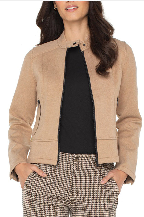 In a soft Camel hue, this modern biker jacket brings a refined attitude to any look. Designed with a sleek zip front, snap-tab collar, and minimalist hardware, it offers a polished take on a classic silhouette. Crafted from a sculpting stretch blend with a soft, brushed feel—perfect for layering over tees, knits, or tailored separates. LM1C17C79