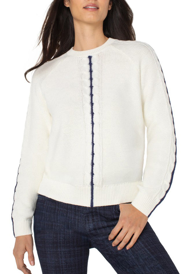 A classic crew with a fresh twist. This raglan-sleeve sweater is knit with subtle cable stitching for texture and depth, while the whisper white and navy palette keeps it timeless. Easy to wear, easy to pair—this is your go-to layer for effortless style. LM8H73SM05