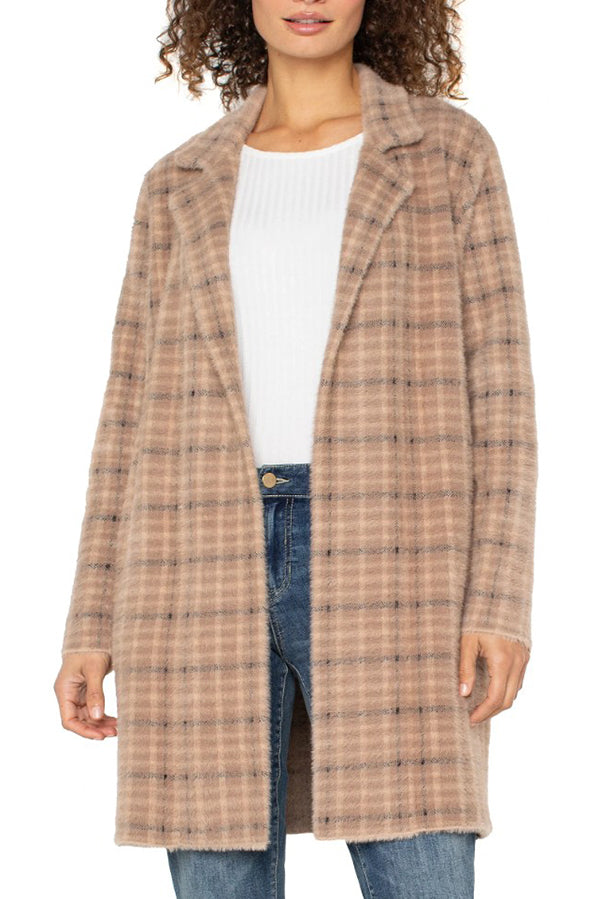 In a soft camel cream plaid, this open-front coatigan is the perfect balance of structure and comfort. Designed with a double notch collar and clean seam pockets, it drapes effortlessly over knits, denim, or tailored layers—your go-to for cozy, pulled-together days. LMC002SK81J2